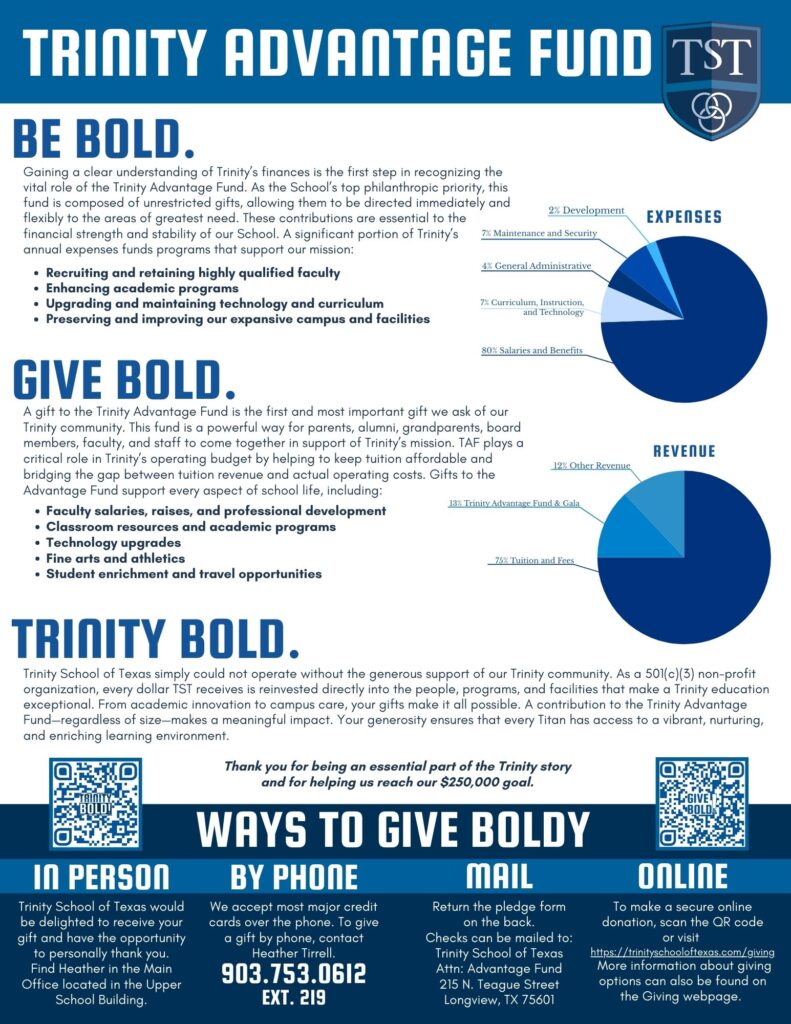 Let’s work together this Fall to give our children the ultimate “ADVANTAGE.” We are asking that 100% of TST Faculty & Staff, Parents, Board Members, and Alumni, give to this vital fund. The Trinity Advantage Fund is our TOP philanthropic priority and every gift matters!